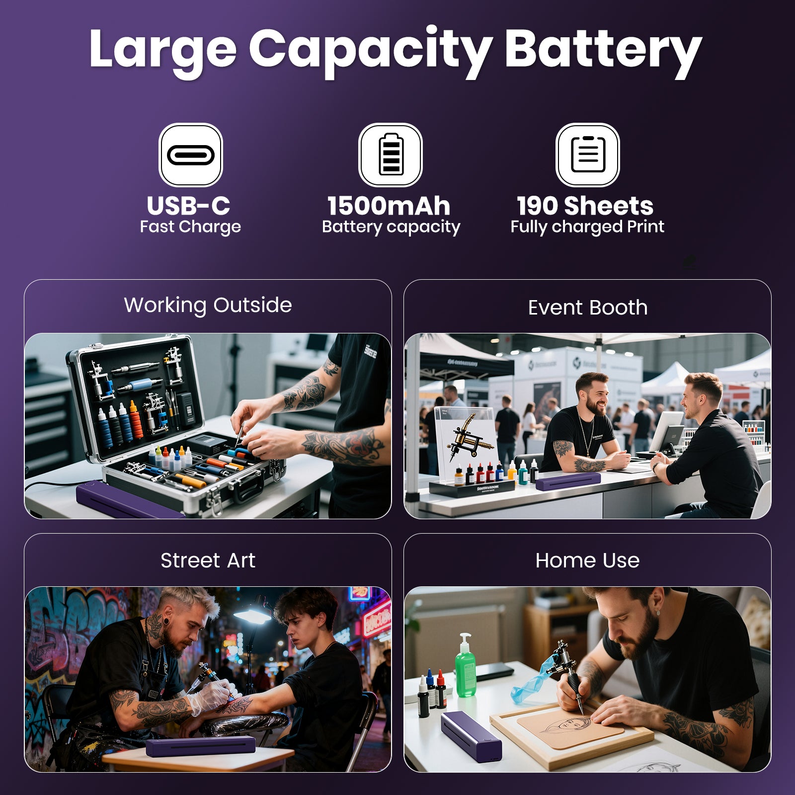 Long-Lasting Rechargeable Battery: This printer is equipped with a 1500mAh battery, which can print up to 190 A4 transfer sheets on a single charge. You can confidently serve clients, attend events, print party temporary tattoos or work at trade shows without worrying about running out of power.